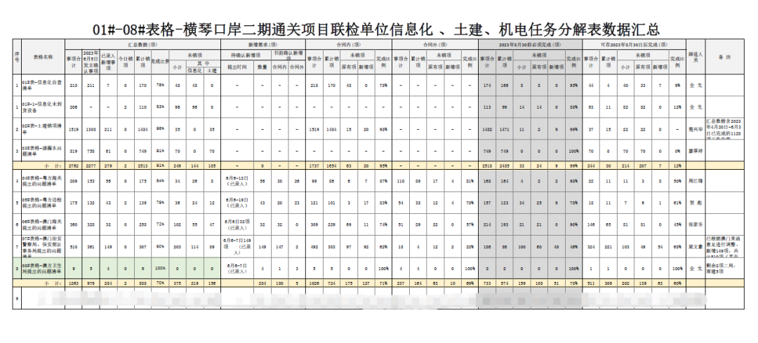 八是清單銷項??诎吨笓]部延續(xù)“5+2”、“白+黑”的工作模式,解決現(xiàn)場推進過程中遇到的實際問題,確保問題不過夜。沖刺階段,更是堅持每天下午17:00組織參建單位召開工作協(xié)調(diào)推進會,重點梳理土建工程、信息化工程剩余工作推進情況、材料設(shè)備到場情況、質(zhì)量問題整改情況等,形成8份銷項表,包括粵方海關(guān)、粵方邊檢、澳方海關(guān)、澳方邊檢、澳方衛(wèi)生局等需協(xié)調(diào)解決的問題,實行“問題清單銷項督辦”的機制,要求各責任人“鎖定需求、對表作戰(zhàn),對照銷項”。據(jù)統(tǒng)計,梳理大小問題多達3000余項。