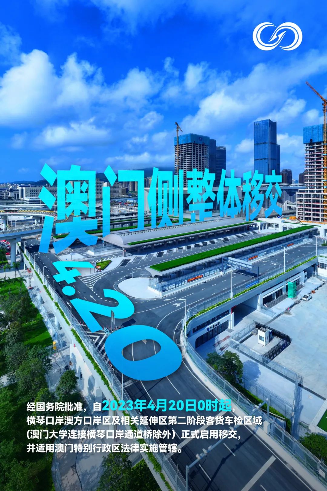經(jīng)國務院批準,自2023年4月20日0時起,橫琴口岸澳方口岸區(qū)及相關(guān)延伸區(qū)第二階段客貨車檢區(qū)域(澳門大學連接橫琴口岸通道橋除外)正式啟用移交,并適用澳門特別行政區(qū)法律實施管轄。